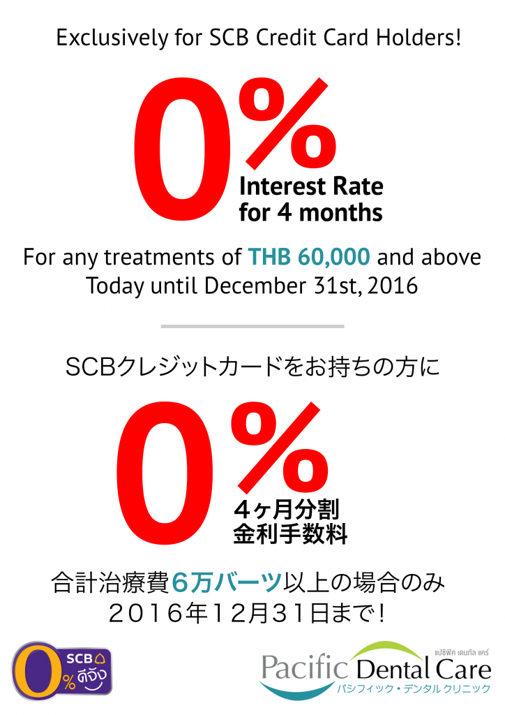 Enjoy 4 months 0% interest installment plan with total treatment value of THB 60,000 and above. Today until December 31st, 2016